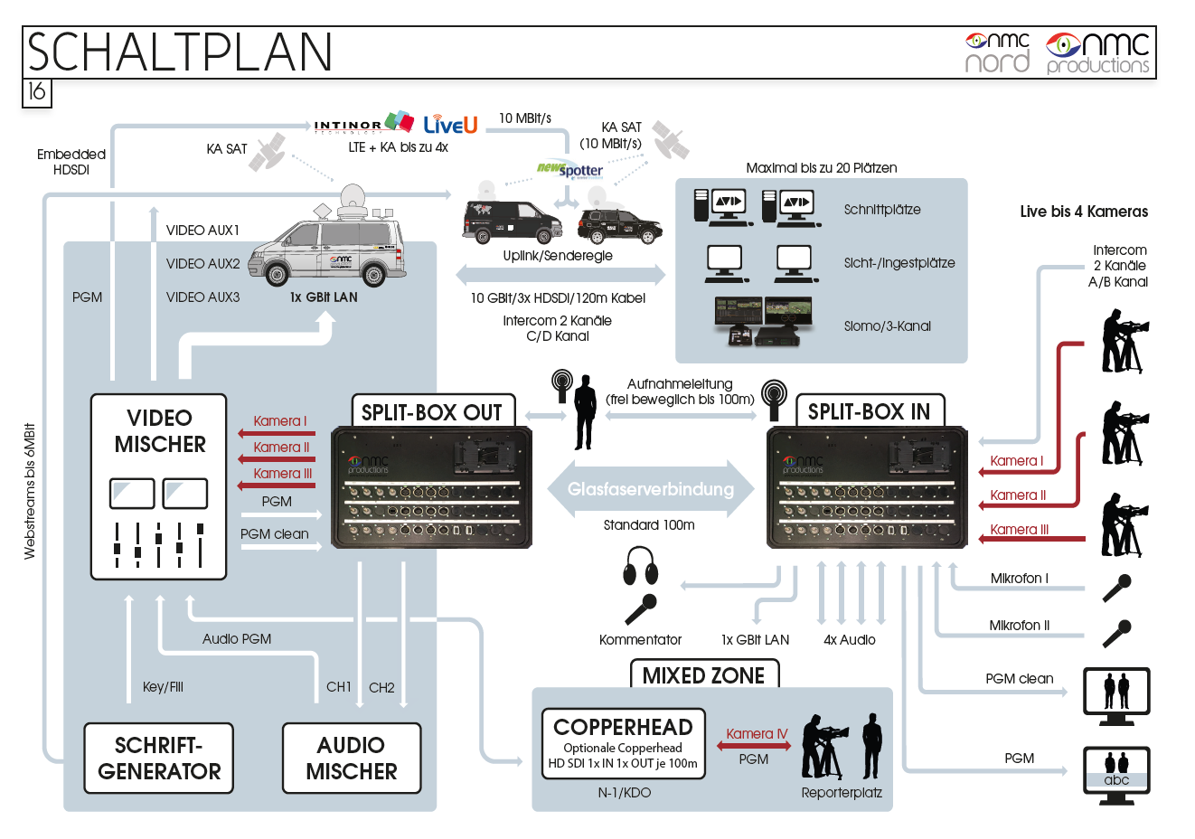 Einfache Produktion Kabellängen bis max 100 Meter, einfache HD/SDI-Verkabelung. (der Kunde sorgt für Kabelsicherheit, ggf. Kabelbrücken/Kabelmatten etc.)
